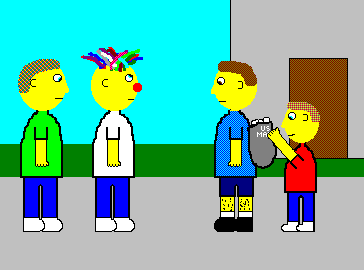 “Shut up, buttwipe! Biff, get him too,” Matt ordered. Before Cow Chip could react, some big tough guy pushed him to the ground too. Matt and Biff were about to kick Cow Chip and Lance in the head when suddenly someone hit Matt with a baseball bat. Biff turned around to see who the attacker was, but all he ever saw was the bat knocking him out cold too.