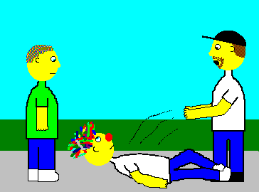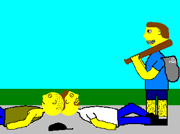 “Shut up, buttwipe! Biff, get him too,” Matt ordered. Before Cow Chip could react, some big tough guy pushed him to the ground too. Matt and Biff were about to kick Cow Chip and Lance in the head when suddenly someone hit Matt with a baseball bat. Biff turned around to see who the attacker was, but all he ever saw was the bat knocking him out cold too.